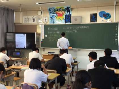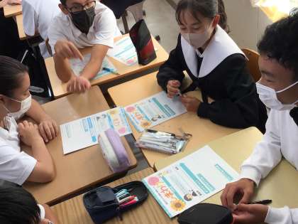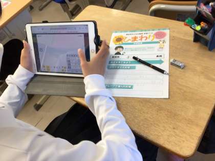 豊田市子どもの権利 学習の学習ノートを使って子ども条例について考えています。自分の意見はタブレットのスカイメニューで提出します。