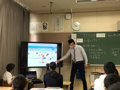 社会科では、アジア州について学習しています。自分の考えをタブレットで回答してみんなの意見を電子黒板で確認しています。その後、全員で話し合います。自分の考えに根拠を入れて発表しています。