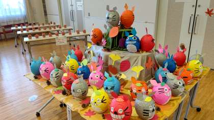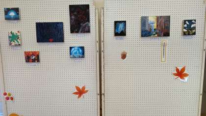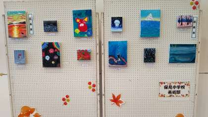 今日は、保見交流館でふれあいウィークの最終日として、イベントが開催されています。昨日展示の会場です。美術部の作品も展示されています。