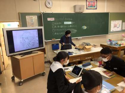 美術の授業では、自分のアイディアスケッチについて班の友だちからアドバイスをもらっています。