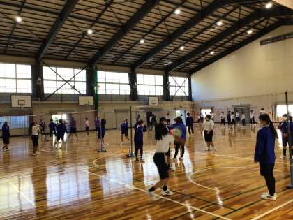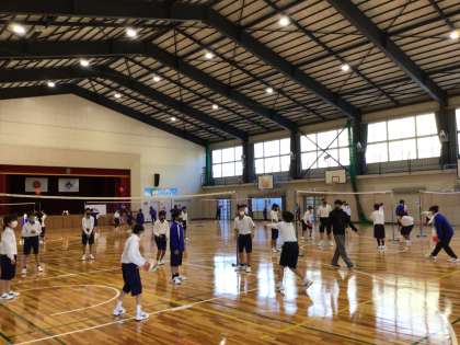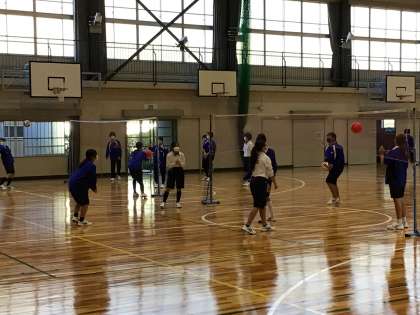 体育のバレーボールの授業です。パスが続いてラリーにするためのグループの課題を解決しながら練習しています。