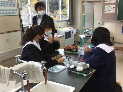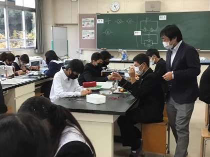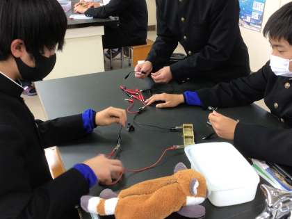 理科ではグループで協力しながら電気回路のつなぎ方を確認しています。
