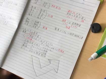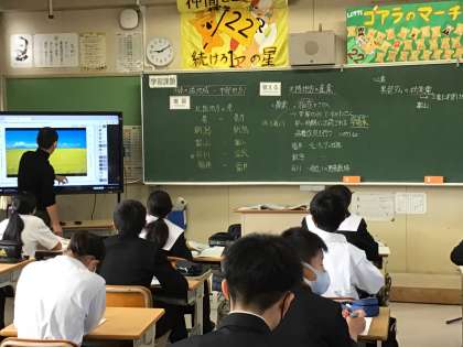 社会科の授業です。板書が焦点化されており、ノートをわかりやすくまとめることができます。