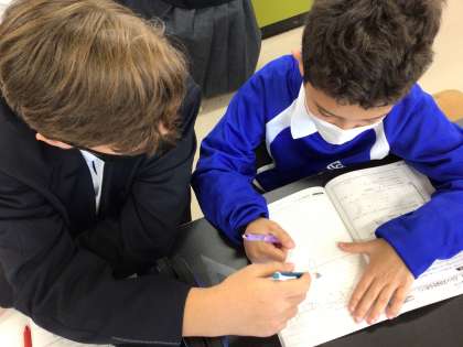 理科と社会科は、クロス取り出し授業を行っています。理科の授業では、わからないところも友だちと教え合っています。
