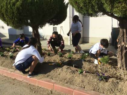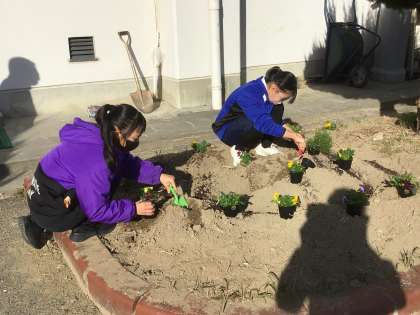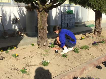 掃除の時間にこれまで土の準備をしてきた1年生の生徒たちが花の苗を植えています。
