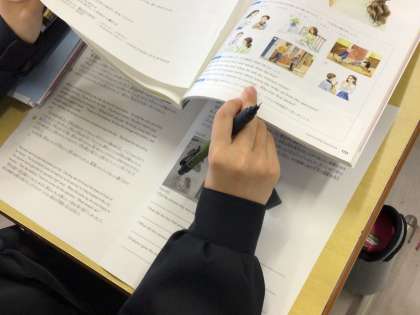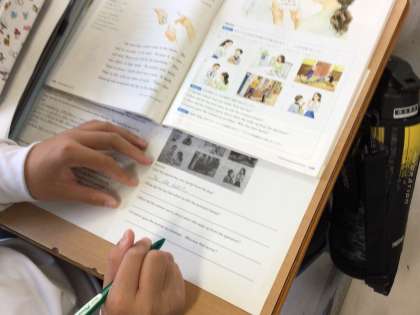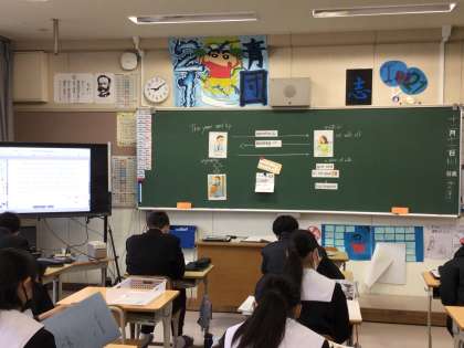 英語では、英文の物語文を読んで内要をプリントにまとめています。