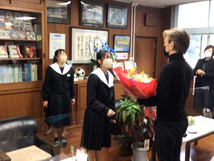 生徒を代表して生徒会役員がお礼の言葉を伝え、花束を贈呈しました。