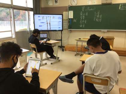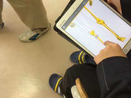 理科ではタブレットを活用して人体の骨について学習しています。