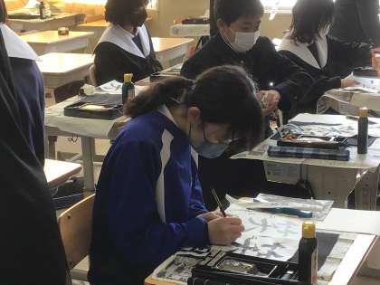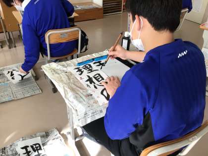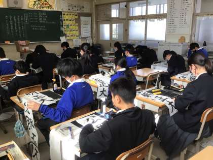 新年の行事として書き初め大会を行いました。どの生徒も練習の成果を示そうと、集中して自分の書と向き合いました。