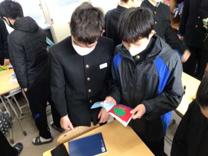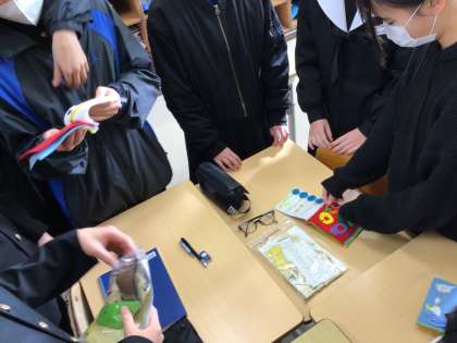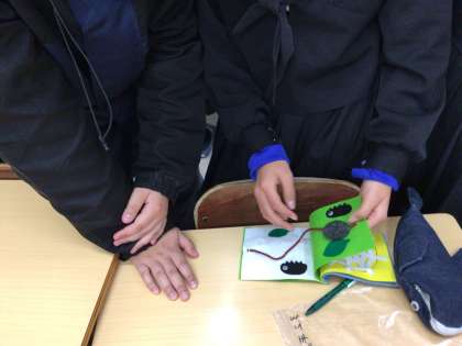 家庭科では、幼児向けに考えたフェルトの絵本を評価し合っています。