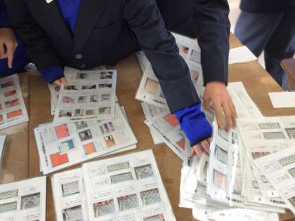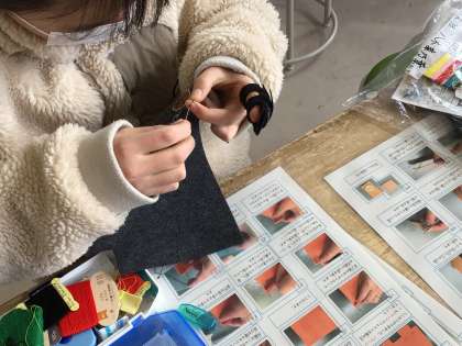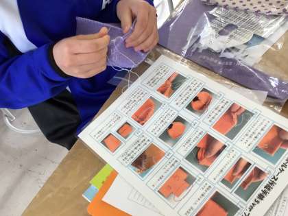 家庭科のペットボトルケースを作っています。作業手順カードを活用して自分で作業を進めます。