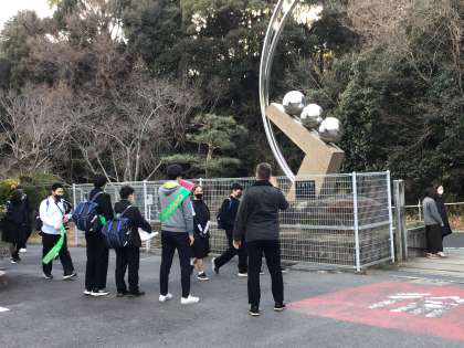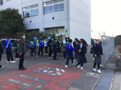 生徒スタッフによるあいさつ運動です。ALTのジョン先生も参加してくださっています。