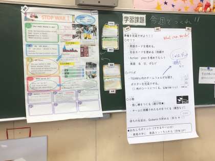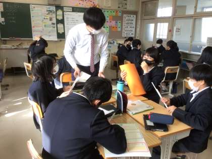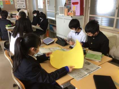 社会では英語との教科横断型の授業を行っています。発表に向けてグループで話し合って準備を進めています。