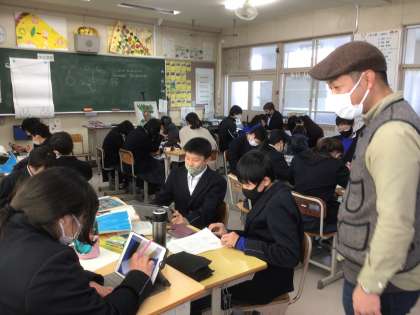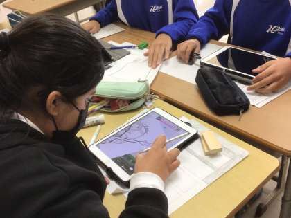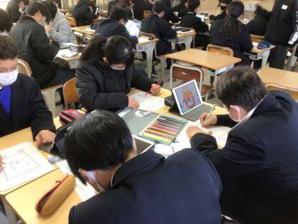 アーティストのデザインを参考に、1組は燃やすごみ、2組は金属ごみ、3組は埋めるごみとプラ・包装容器ごみのデザインをしています。タブレットを活用して描いている生徒もいます。