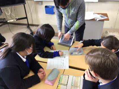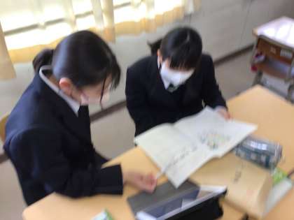 社会科と英語の教科横断型授業です。ポスター発表に向けての原稿準備です。グループで役割分担をして考えます。