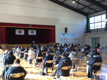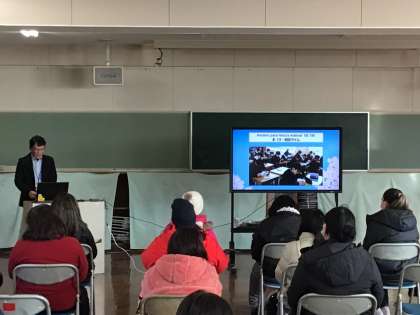 令和5年度の入学説明会です。学校概要やアレルギー、就学援助等の説明をしています。外国人生徒保護者の方には、パワーポイントで視覚化しています。