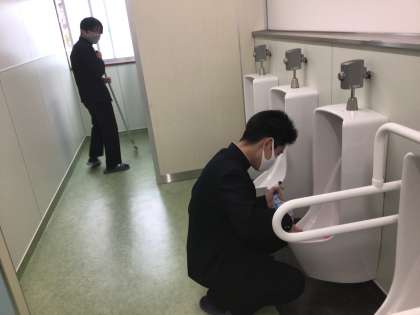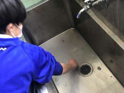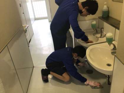 トイレや流しの冷たい作業も真剣に取り組みます。
