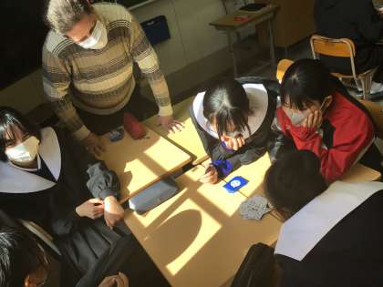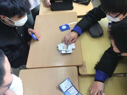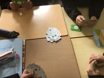 英語の授業には、ALTのジョン先生とカードゲームで楽しんでいます。