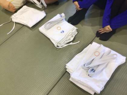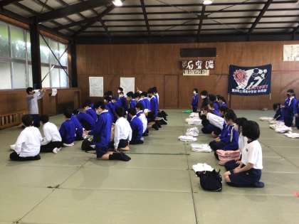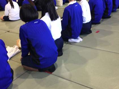 体育は、柔道の授業が始まります。正座の方法から学びます。少し緊張しています。