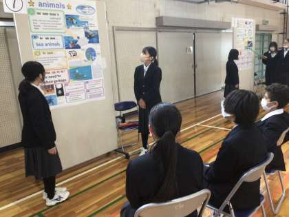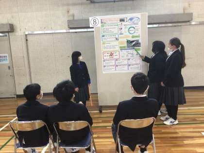 社会科のポスター発表のリハーサルを体育館で行っています。
