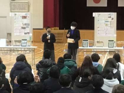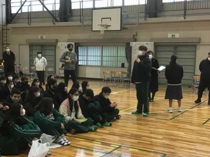 発表を終え、まとめの会をしています英語での漫才を披露し、保見中、ブラジル人学校それぞれの生徒が感想を発表しました。
