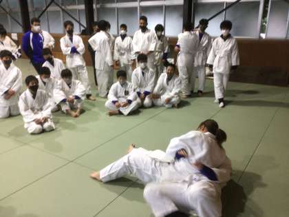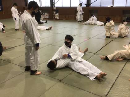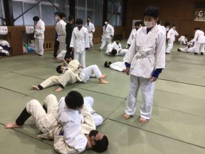 体育では柔道を行っています。教師の模範を参考に、袈裟固めの練習をしています。