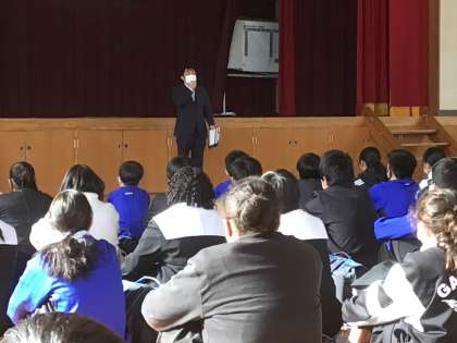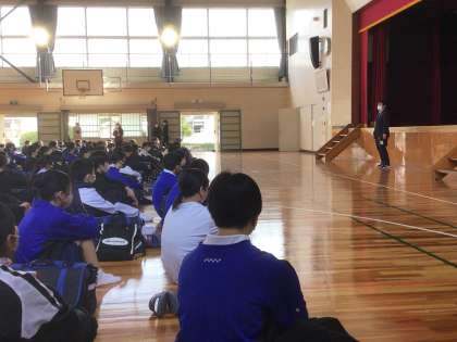 3年生を送る会での合唱に向けて学年主任の話を聞き、学年全員で合唱の練習を行いました。