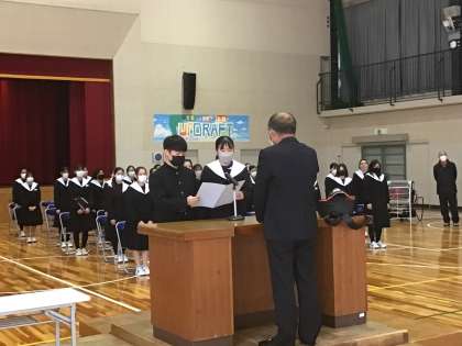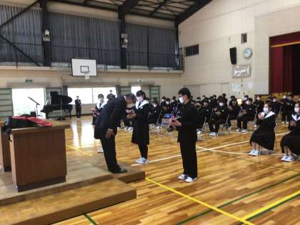 同窓会の入会式です。顕彰生徒の表彰や代表生徒の誓いの言葉、記念品授与を行っています。