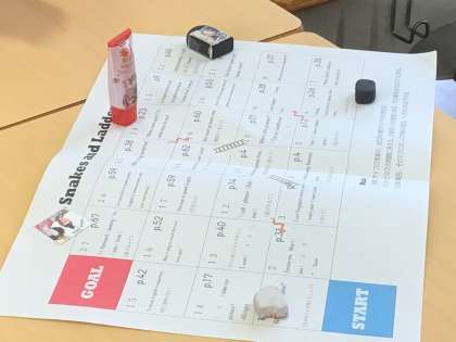 英語では学習した表現を使う英語すごろくにグループで協力しながら取り組んでいます。