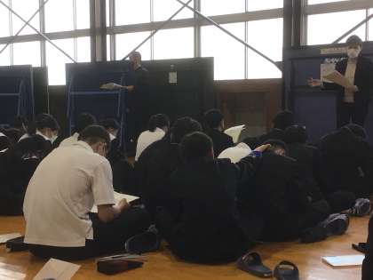 自然教室に向けて、しおりを使って日程の確認などを行っています。