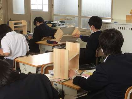 技術では完成させた本棚について、タブレットを活用してまとめを行っています。