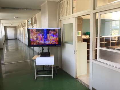 2年生保護者待合室の前には大型テレビを設置し、2年生の社会科で生徒が作成した各地の紹介動画を流しています。ご来校の際はぜひご覧ください。