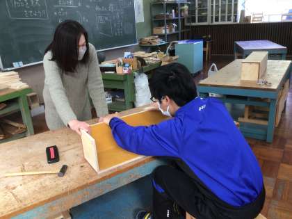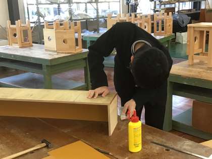 技術で作成している本棚の仕上げを丁寧に行っています。