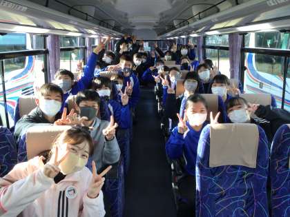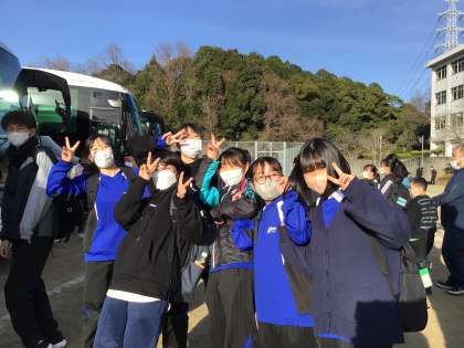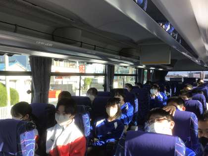 多くの方々に見送られ自然教室に出発しました。バスの中で動画による出発式を行っています。