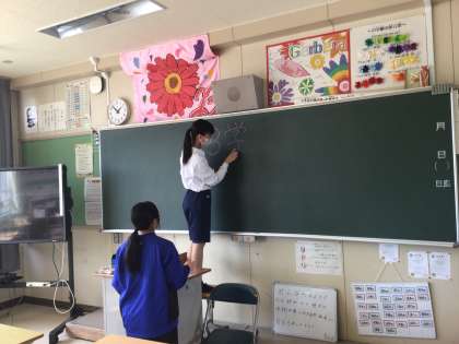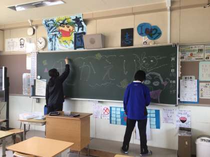 1年生が、黒板にメッセージを描いて帰着の準備をしています。