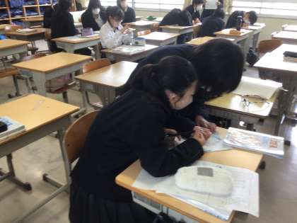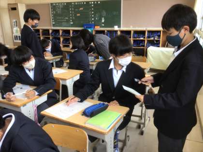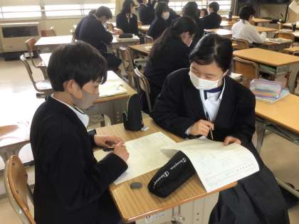 数学では学年のまとめをしています。生徒相互で教え合いながら問題を解いています。