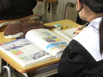 理科では天候について学んでいます。重要語句が分かるように大型テレビで提示しています。