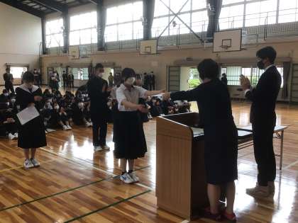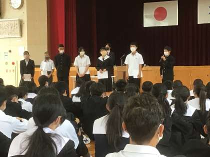 令和5年度前期生徒会役員の認証が行われ、新会長から決意の言葉が述べられました。