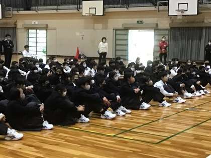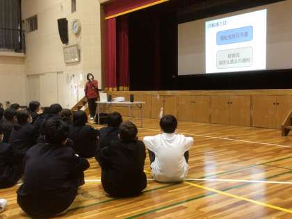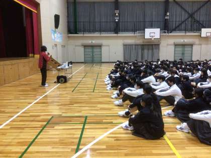 交通安全センターから講師を招いて自転車の安全運転に関する話を聞いています。