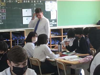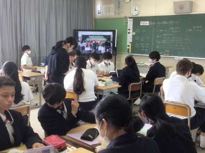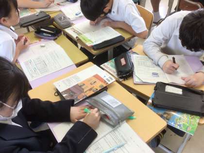 英語では春休みの生活を英語で書く活動にグループで協力して取り組んでいます。