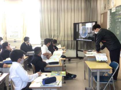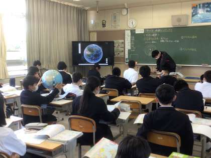 社会科では電子黒板と地球儀を使って地図の特徴を確認しています。