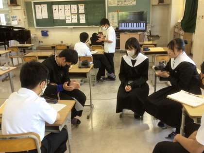 音楽ではグループごとに各自が考えたリズム打ちの練習をしています。