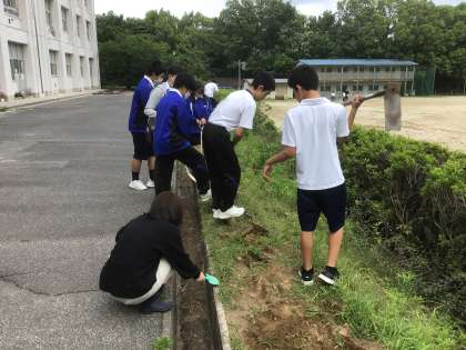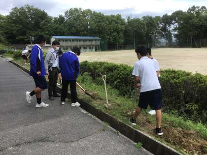 理科ではヒマワリを植えるために土を耕しています。