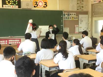 明日からの修学旅行に向けて、2年生から3年生へお守りとてるてるぼうずが送られました。