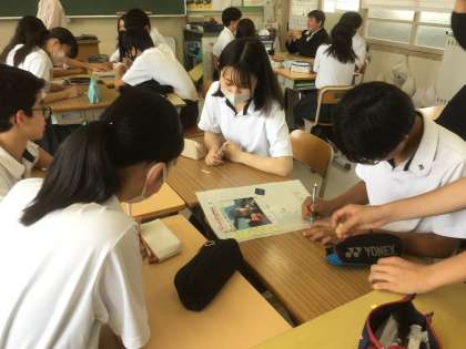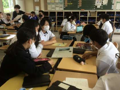 自然教室の写真を使って作成したホミスタグラムの共有をし、感想を伝え合っています。