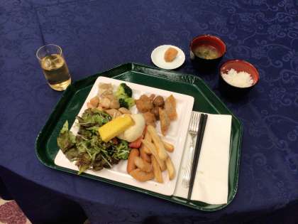 こんなメニューでした。(あるおかず全種類)これにご飯、味噌汁、スープ、デザート、ウーロン茶、リンゴジュース、ミルク、水が飲み放題。