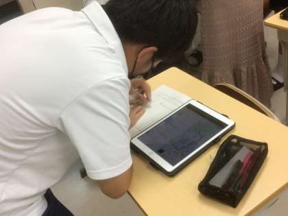 夏休み中の体験入学に向けて、行き方を調べてアクセスカードに記入しています。