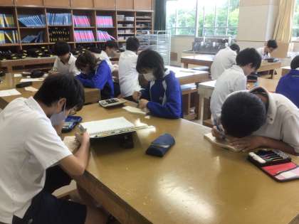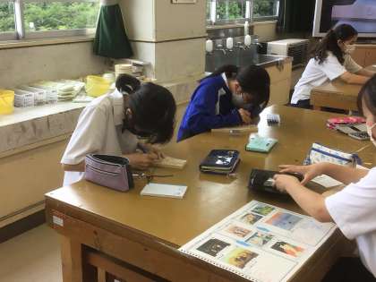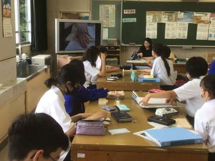 美術ではルームプレートの彫刻をしています。彫刻刀の安全な使い方を大型テレビで確認し、作業を進めています。