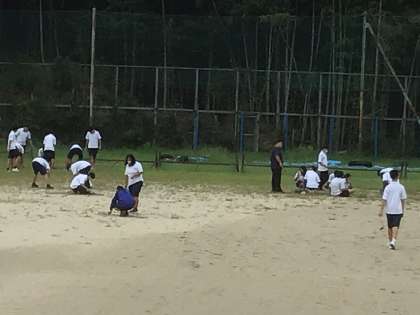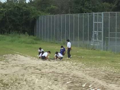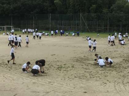 生活、図書、給食スタッフは運動場の草抜きを行っています。