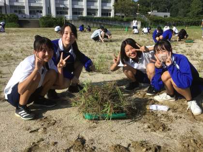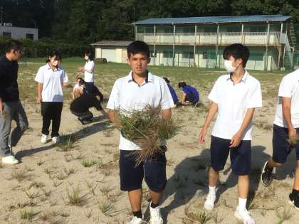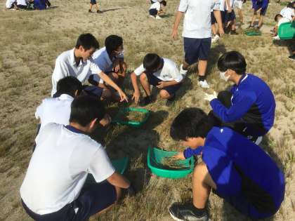 掃除の時間に3年生が学年全体で運動場の草取りを行いました。